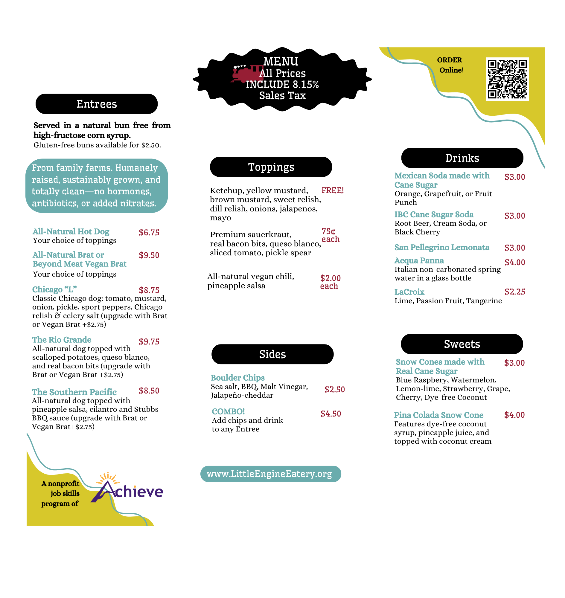 Since 2017, the Little Engine has provided high-quality food, such as humanely-raised meats and vegan options, to area residents and tourists. As a 501(c)(3) social enterprise of Achieve, Inc., the Little Engine provides paid work experience and job training for neurodivergent people in Chaffee County and surrounding communities, enabling them to obtain and maintain meaningful employment. Neurodivergent refers to autism spectrum, ADD/ADHD and similar learning disabilities.